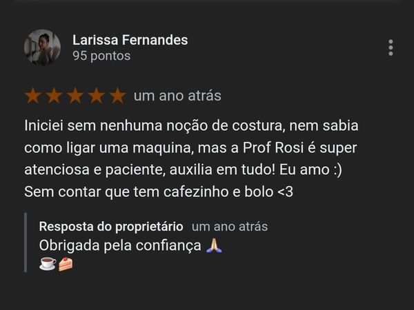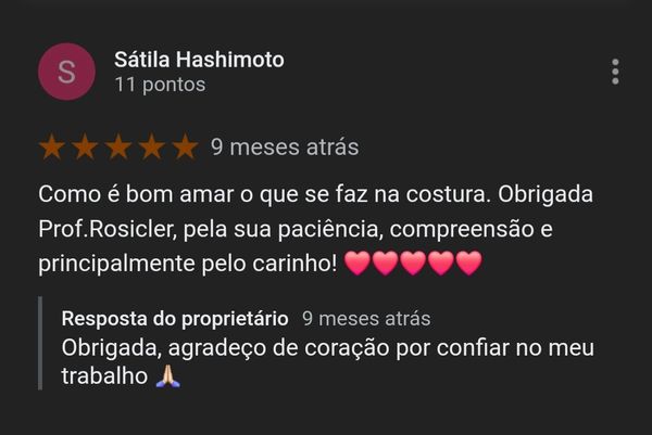 Hoje no ateliê tenho atendimento com aulas diárias, um espaço agradável e acolhedor, onde muitas pessoas vem até ele para realizar sonhos de infância como o meu, pessoas que levam sonhos para casa, fazendo a diferença na vida de outras. Quando uma aluna confecciona sua primeira peça, não é uma simples roupa ou tecido, ali tem uma história, talvez até de superação!